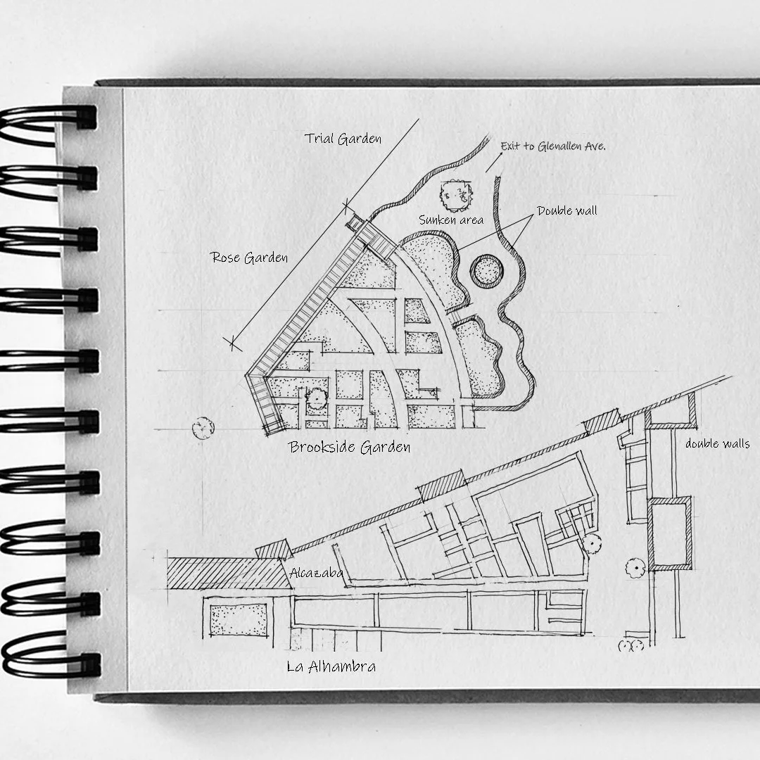 The fan shape of Brookside's Rose Garden is also similar to the Alhambra's Alcazaba. At Alcazaba, ancient Arabs used double walls to enclose the fortress, for defence; in Brookside Garden, the designer uses double walls to carve out another sunken landscape, for pleasure.
