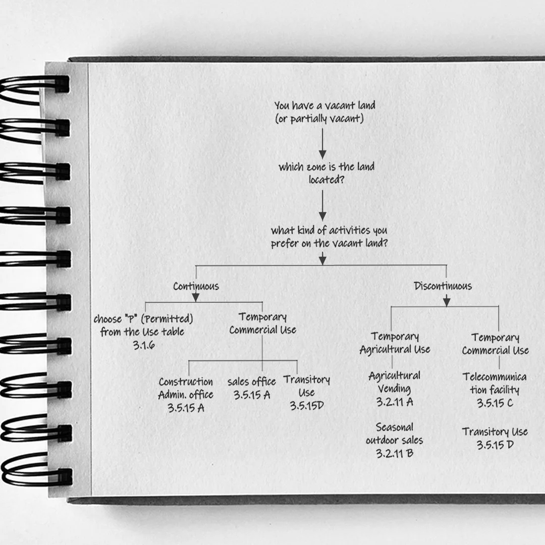 Whether you are located in a residential zone or a commercial zone, checking the use table and determining suitable uses is the critical first step for programming the property. If you are looking specifically for temporary uses, the table shows several program possibilities.The use table looks like the following: