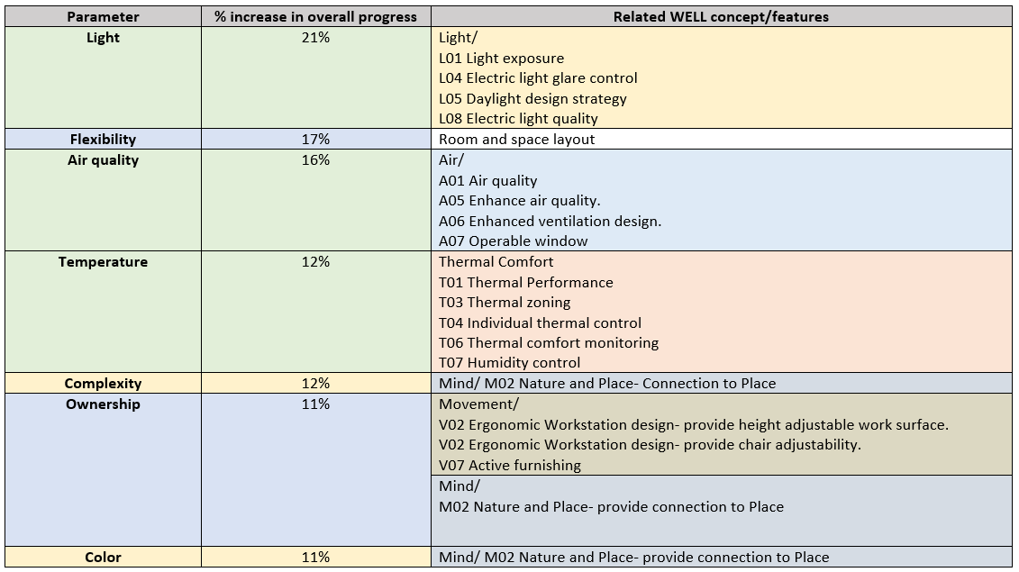 Last, light has the most positive impact on students' learning than other factors. Seven of the ten environmental parameters investigated in this study significantly improved pupils' overall progress. We can apply these principles in the future learning space. In the following table, I restructured their influence based on the research's final findings.