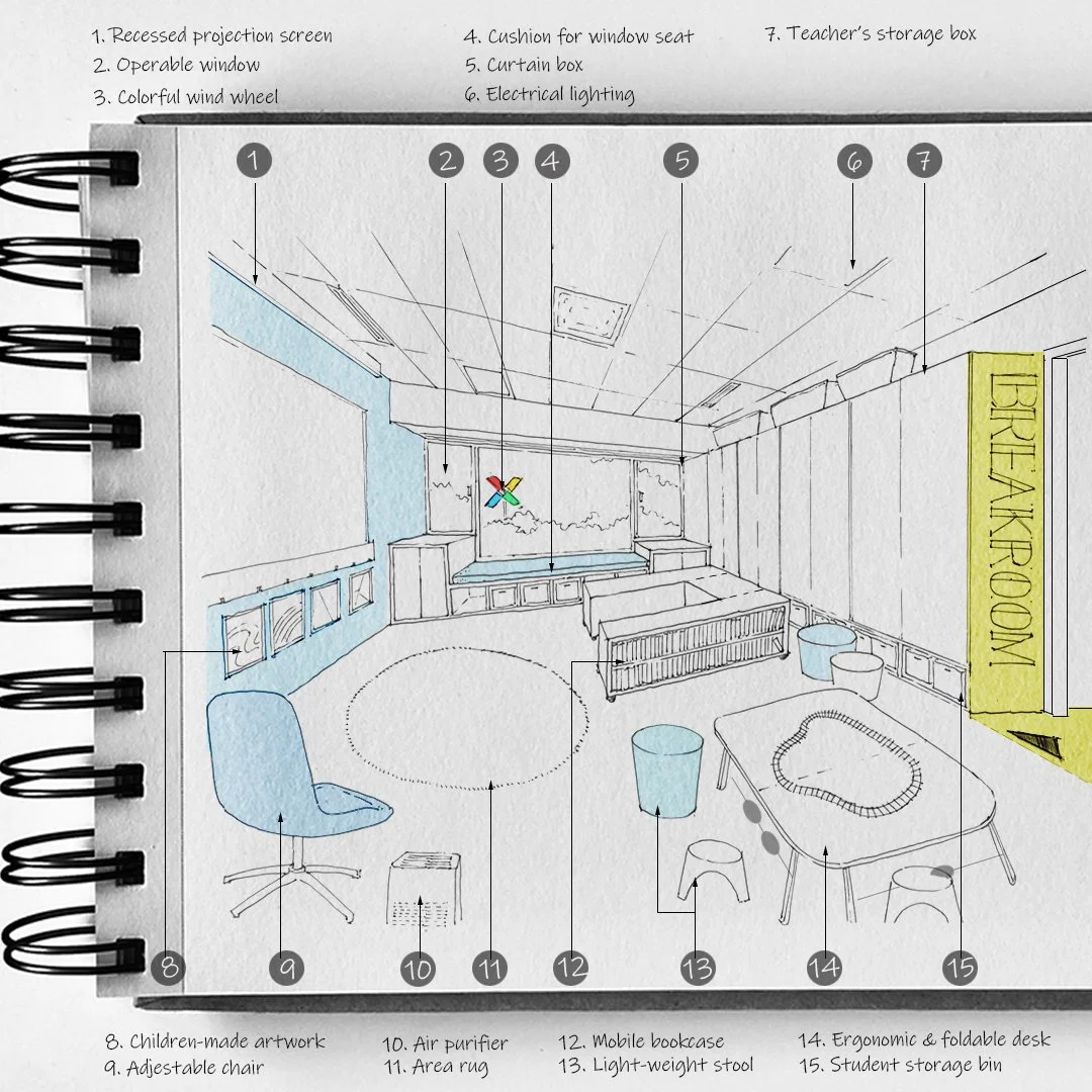What kind of learning environment could we expect in the future? If we follow his study and prioritize those influential building design parameters, we can create the following space. Once children are mentally and physically well, it is not surprising to see students' engagement increase and their learning performance grow.