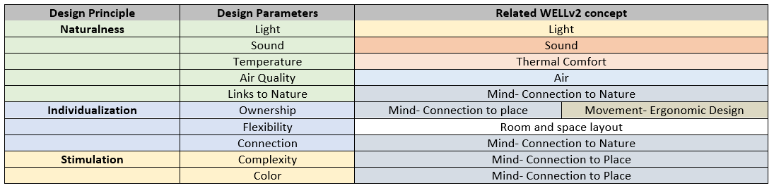 In Barrett's environment-behavior model, three dimensions (aka the design principle) have been used to structure his study and measurement: Naturalness, Individualization, and Stimulation. And each of them constitutes several factors. To understand how his environment-behavior model correlated with WELL concepts, refer to the following table.
