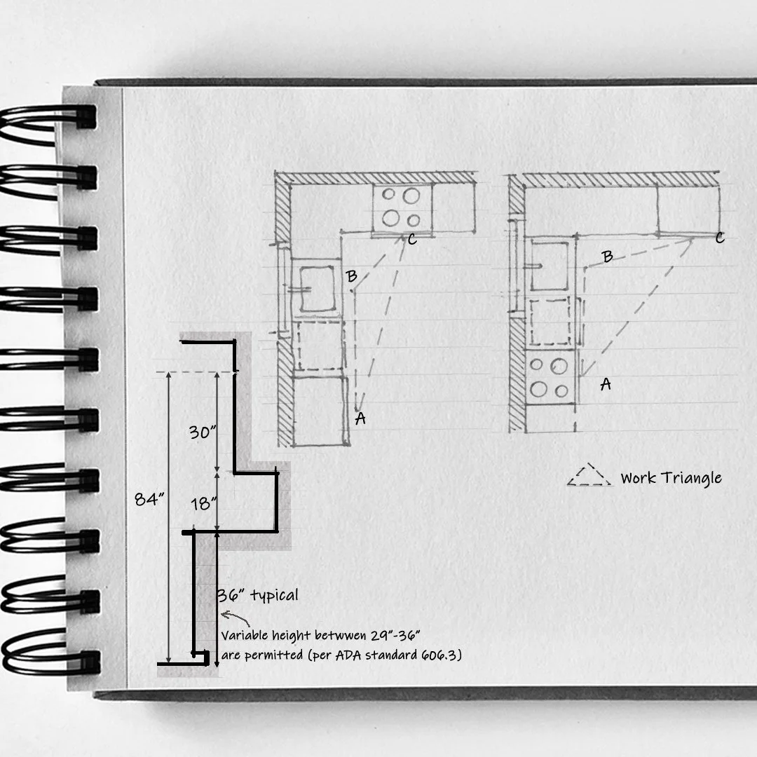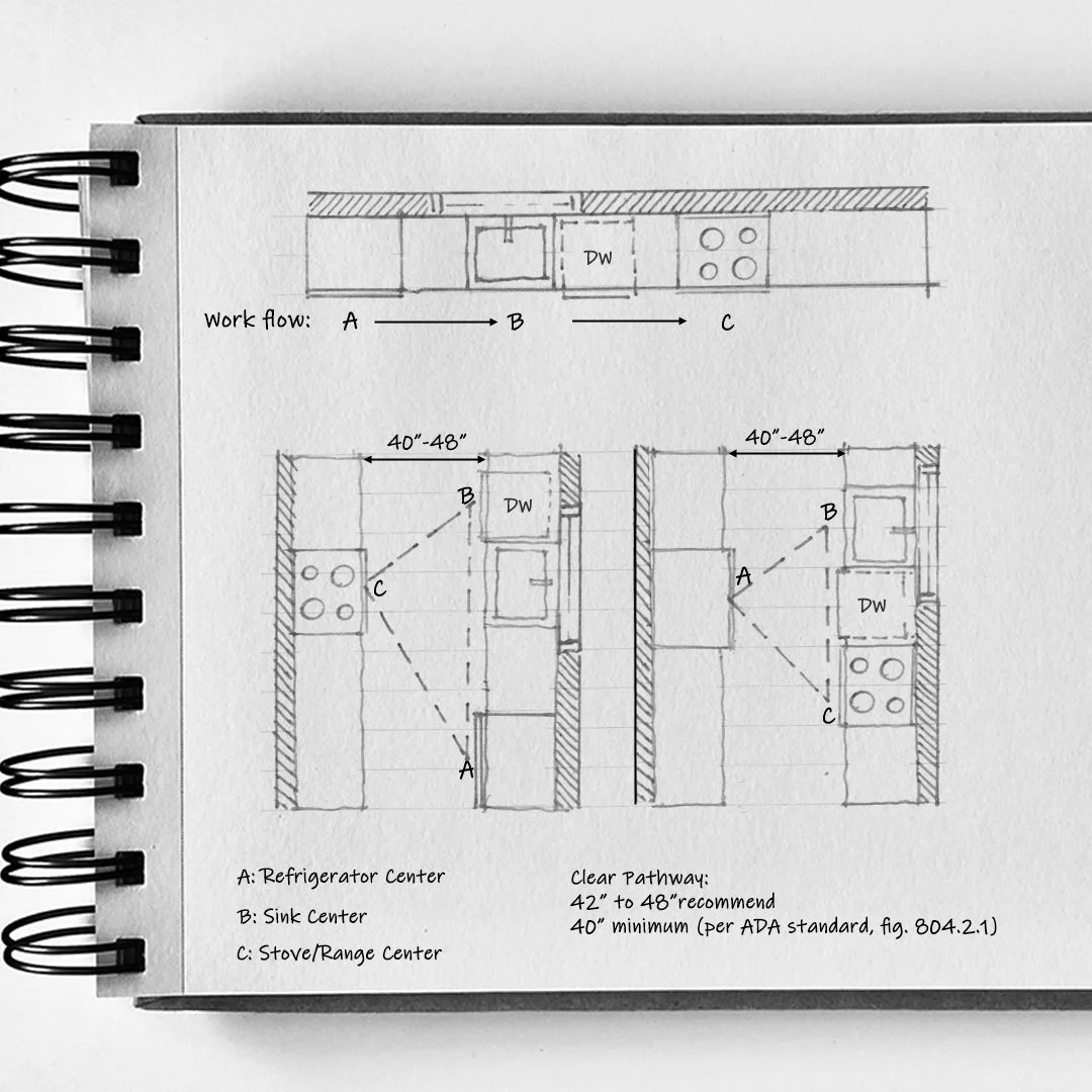 Start with the work triangle. (The work flow circulate among sink, stove/range, and refrigerator)